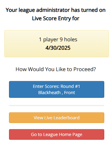 When a player logs in with Live Scoring enabled, they will be presented with the live scoring screen that shows what round is enabled. If you play split tee times (going off front/back at the same time) both sides will be displayed, otherwise the single round will be displayed that they will choose to begin. If they don't want to keep score at this time, they can view the leaderboard or go to the league home page.