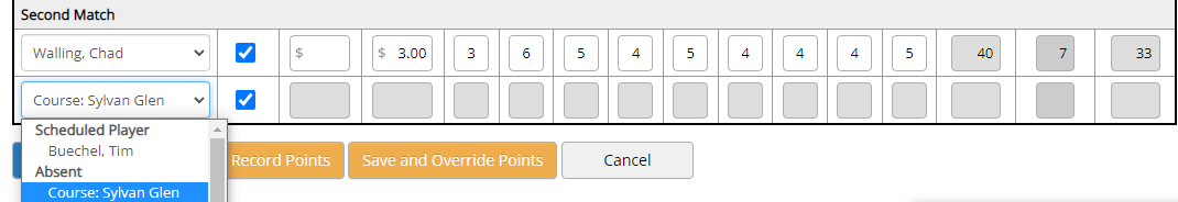 Let's take this example of a scorecard, where Chad and Tim are playing against each other, and Tim is absent. The league administrator clicks on Tim's name and chooses the "Course" from the player drop down, under the "Absent" heading. When he does so, the score entry for Tim is greyed out since the scores for the course are automatically generated based on Par for that course.