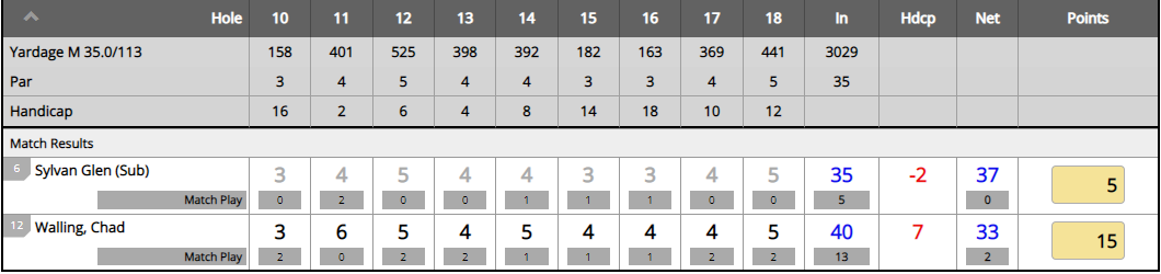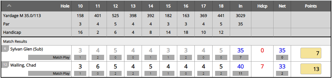 In this particular league, they play match play for 2 points per hole, and 2 points for the low net score. Chad is a 7 handicap, and the course is a 0 handicap. Thus Chad receives 1 stroke on each of the 7 hardest holes (all the holes except #10 and 16). Whatever points the course wins are automatically applied to the absent player, just as if the course was an actual substitute. You can set point limits for the absent player if so desired.