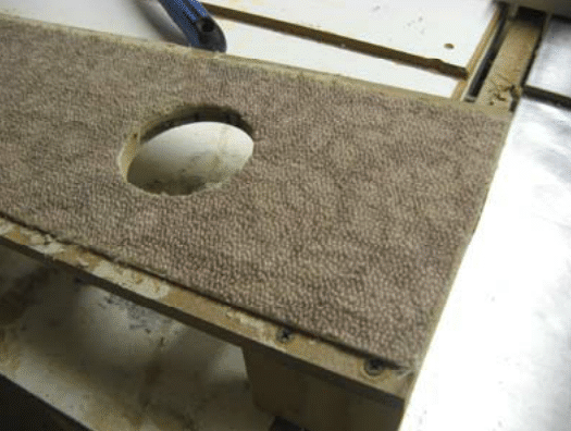 Let it dry for a half hour or so, then trim the carpet to the size of the MDF. Take some time to cut out the hole in the carpeting. Use a new blade for best results.