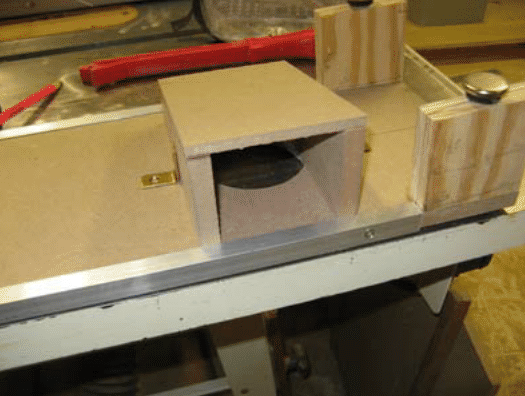 This nail is a pivot point for your circle. Move your ¼” straight cutting router bit so it’s just below the surface of the table. Place your board on the nail, and stick the nail into the hole in the table. You should be able to swing the board in a complete circle. Start your router and raise the bit so it enters the work piece. Keep raising the piece until it goes through the piece, and slowly rotate it around until it almost cuts a complete circle. Stop just short and turn off your router.