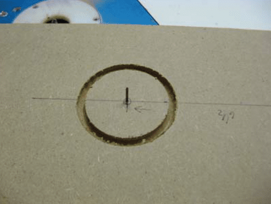 Find the center of the hole on the main putting surface. Mark a spot about 6 ½” from one end of the board on the centerline. If you’re using a hole saw, go ahead and cut it out. For the router, mark a spot on your router table 1 ½” from the opposite side of the straight cutting bit. Take a penny nail and find a drill bit of the same size, and drill a hole in your table and in the center spot on the putting surface. Don’t go all the way through the putting surface; otherwise the nail may just go right through it.