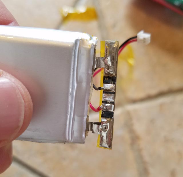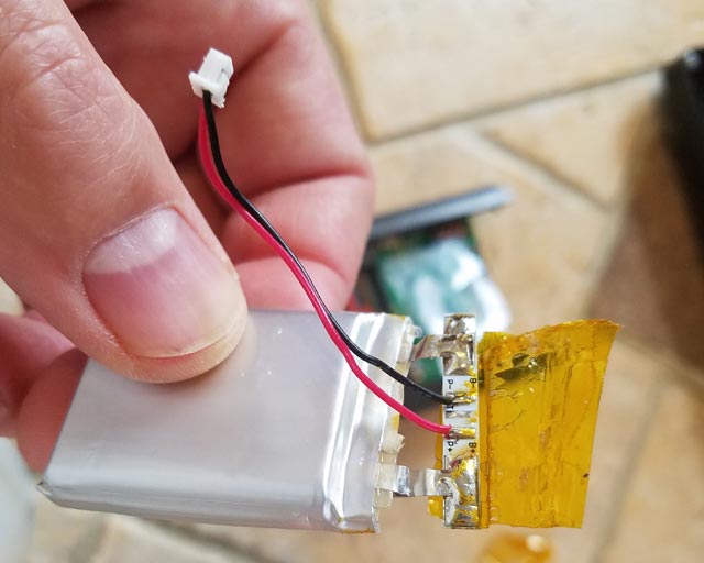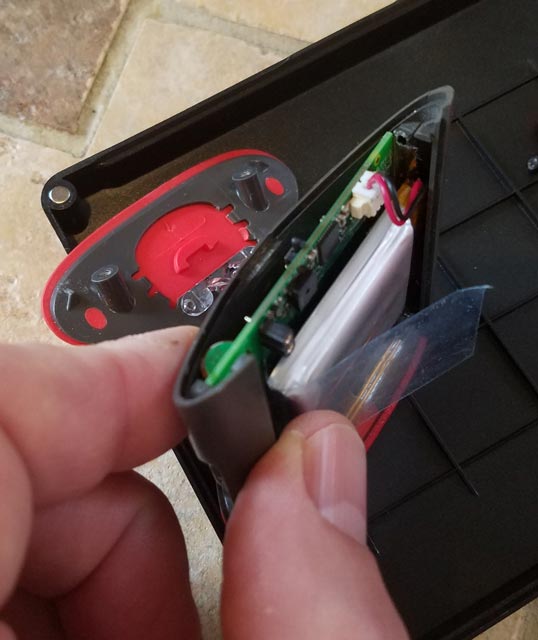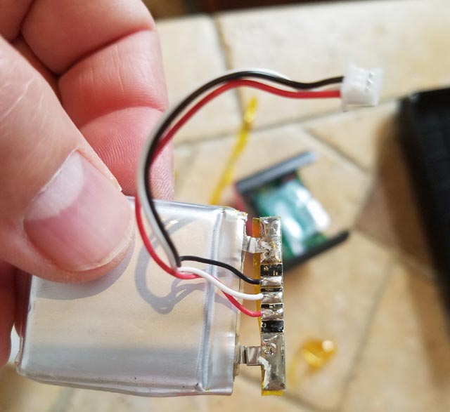 Unsolder each of the connectors from the battery. The GameGolf device only uses 2 connections, so you need to solder the old wire on the new battery. Note the black and red connections on the new battery so you get them in the correct place, and also note the routing of the wires between the battery and terminal board. The 3rd white terminal in the center on the new battery will not be used. After soldering, fold the terminal board back down and cover with the old cellophane tape. If you've ruined the tape, you should get some electical tape to protect the terminals.
